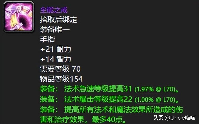魔兽世界国际服燃烧的远征(全能之戒)属性:34 智力32 法术伤害法术暴击与命中优秀